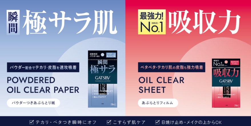 ギャツビーのあぶらとり紙には、皮脂吸収パウダー配合でサラサラ感が持続する「パウダーつきあぶらとり紙」と、表面のミクロの穴で皮脂を瞬時に吸収する「あぶらとりフィルム」の2種類があります。